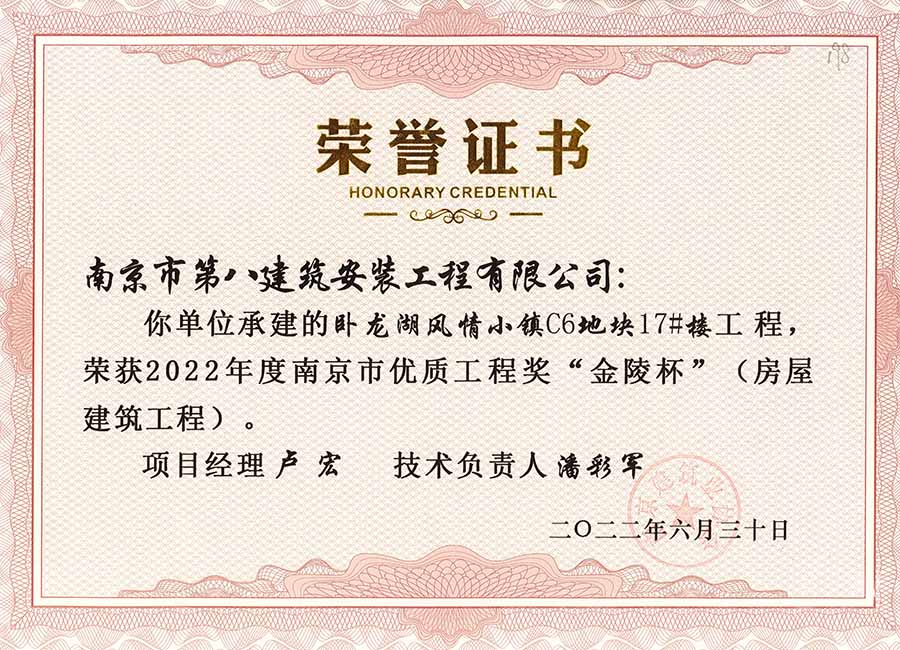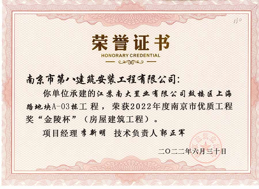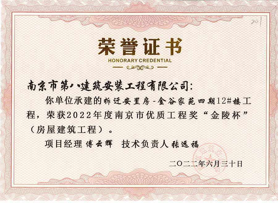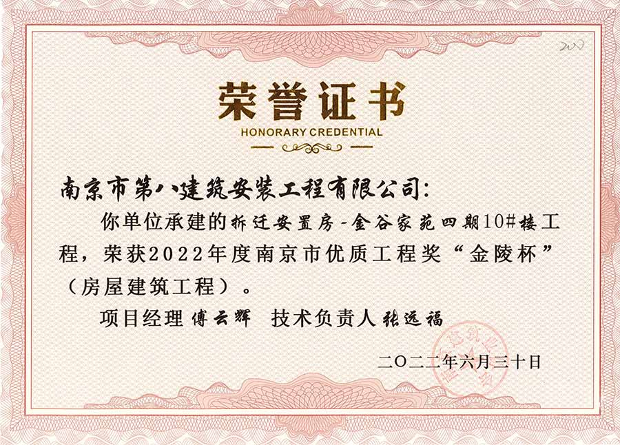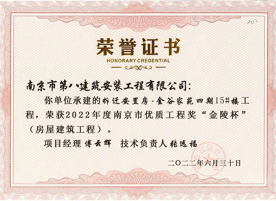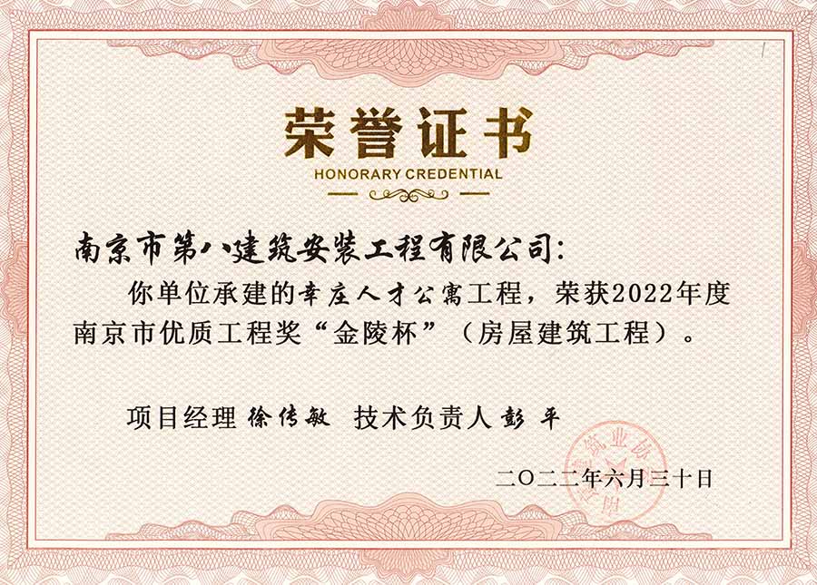 6月30日,南京建協(xié)下發(fā)了(2022)24號(hào)文件《關(guān)于公布2022年南京市優(yōu)質(zhì)工程獎(jiǎng)“金陵杯”(房屋建筑類、軌道交通工程)項(xiàng)目名單的通知》,決定授予“幸莊人才公寓”等208個(gè)項(xiàng)目為2022年南京市優(yōu)質(zhì)工程獎(jiǎng)“金陵杯”,我公司承建的13個(gè)項(xiàng)目榮獲榮譽(yù)。